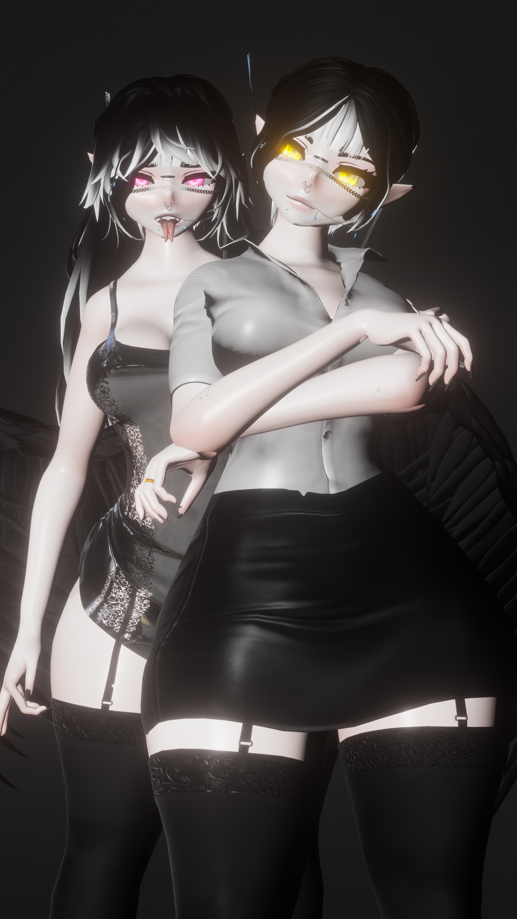 Full DPS & Orifaces! (NSFW), FBT Ready, Wings with wing animation set controller, Ruler prop, Horns toggle, 1 Skin Alternate Swap, Hue Shifters and Suturation Shift on hair and 1-3 Hair Swaps with 6 Combinations + Eye Hue Shifter, Poiyomi 8.2 Shaders (Requirement), 2 Outfits Office Set+Dress (8+ Toggles) , GoGoLocomotion + Scaler
